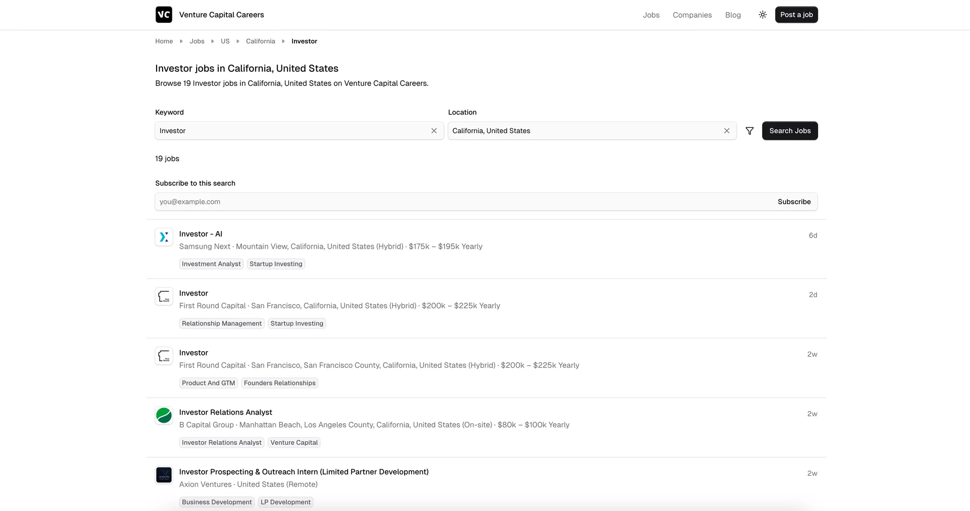VC and accelerator portfolio job boards aggregate openings from portfolio companies. Most don't charge for postings. The value is in supporting portfolio success.